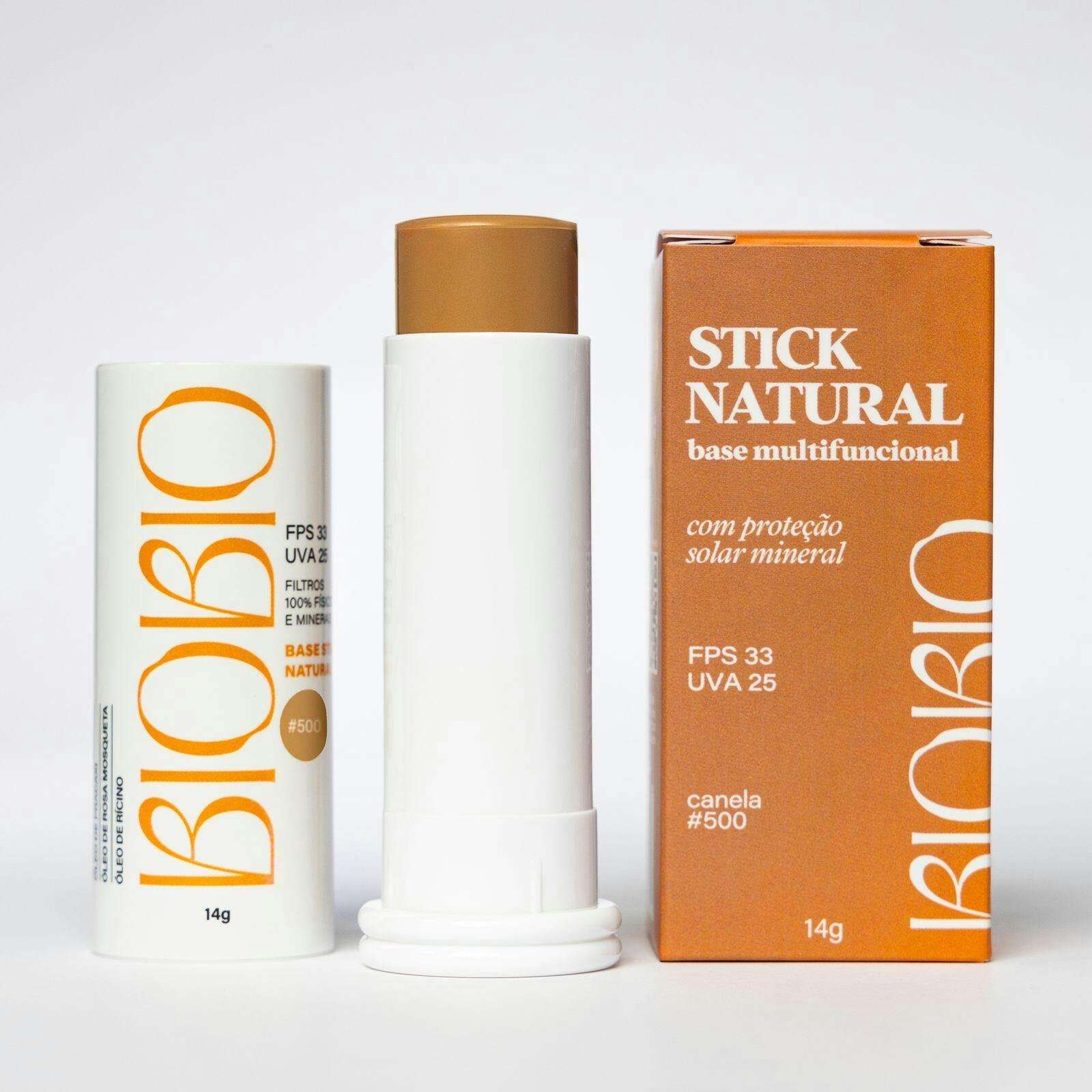 Base Stick natural BioBio cosméticos com FPS 33 e UVA 25 e ativos de cuidados com a pele, disponíveis em 8 tons.